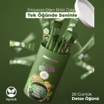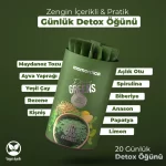 İçindekiler: Spirulina Ekstraktı, Yeşil Çay, Maydanoz Tozu, Biberiye, Ayva Yaprağı Tozu, Limon Ekstraktı, Rezene, Açlık Otu, Papatya, Anason, Kişniş, Maltodekstrin, Stevia, Doğal Kayısı Aroması, Yeşil Elma Aroması.